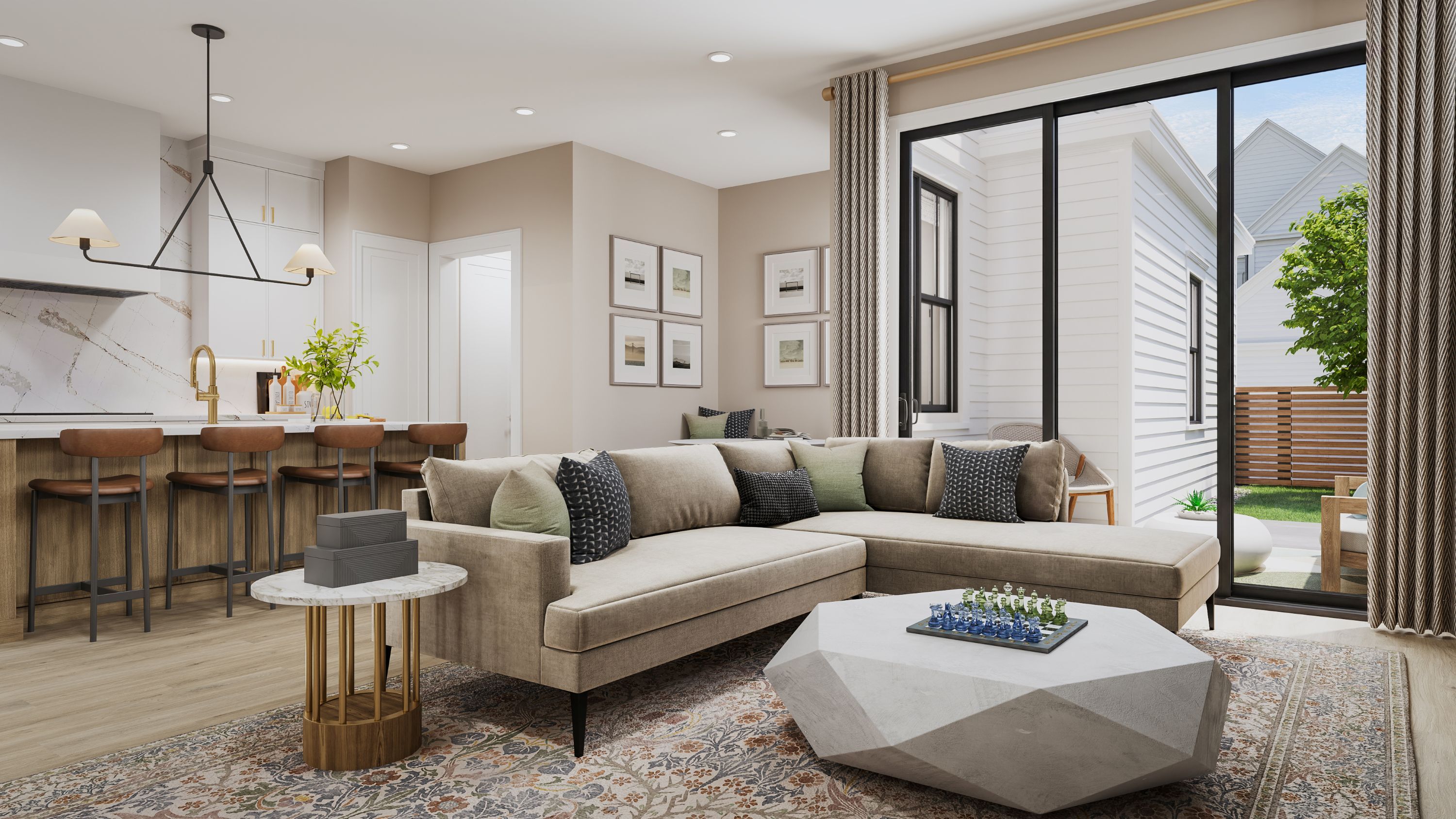 The Sterling is a modern single-family home offering spacious, light-filled interiors, open kitchen, and an eco-friendly all-electric design. The home also features 2-car garage parking, private yard, optional finished lower level and attic space, and an optional elevator.